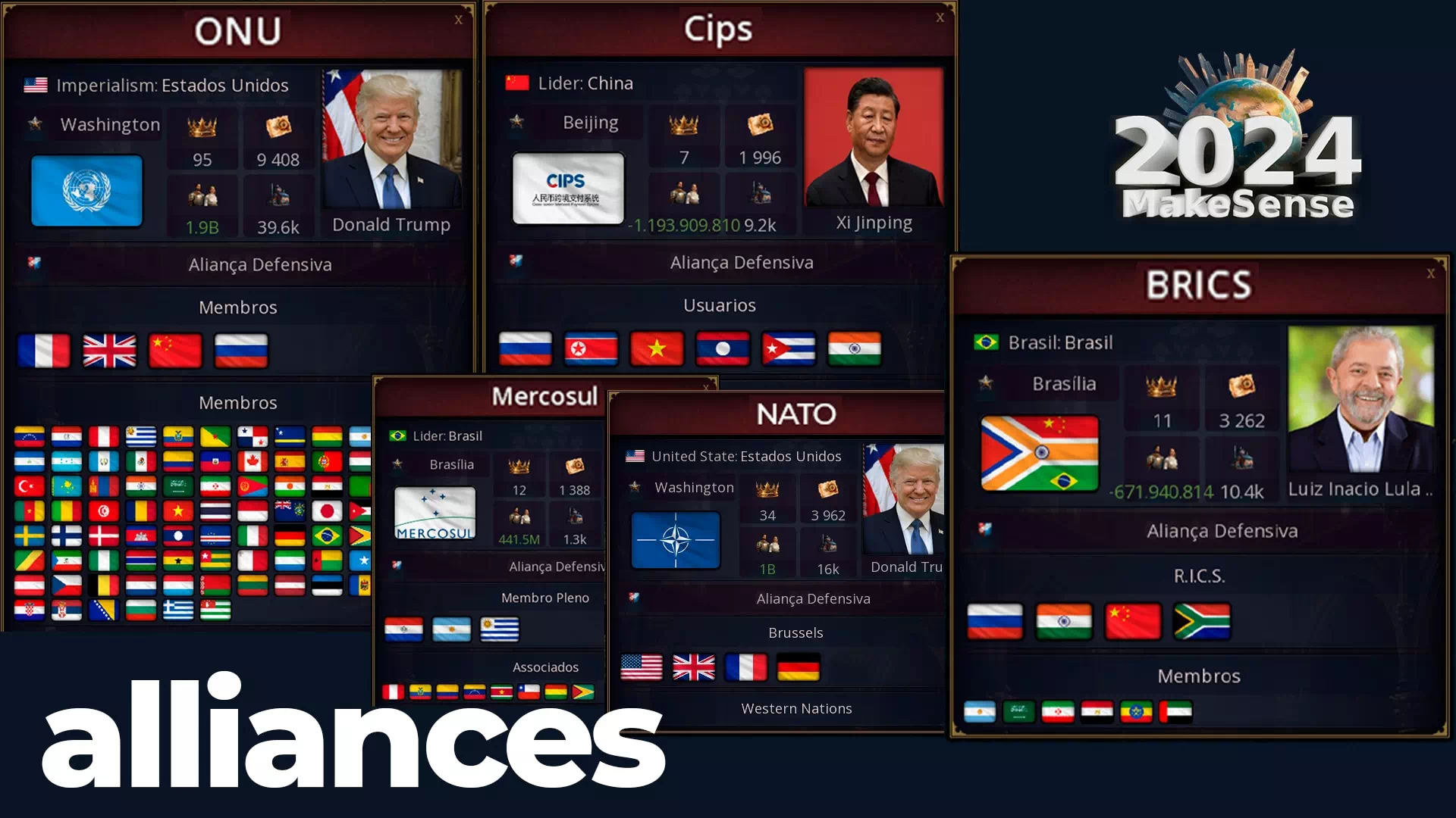 — Реалистичные альянсы: такие альянсы, как ONU, NATO, BRICS и MERCOSUL (Все альянсы пока оборонительные из-за ограничений игры).