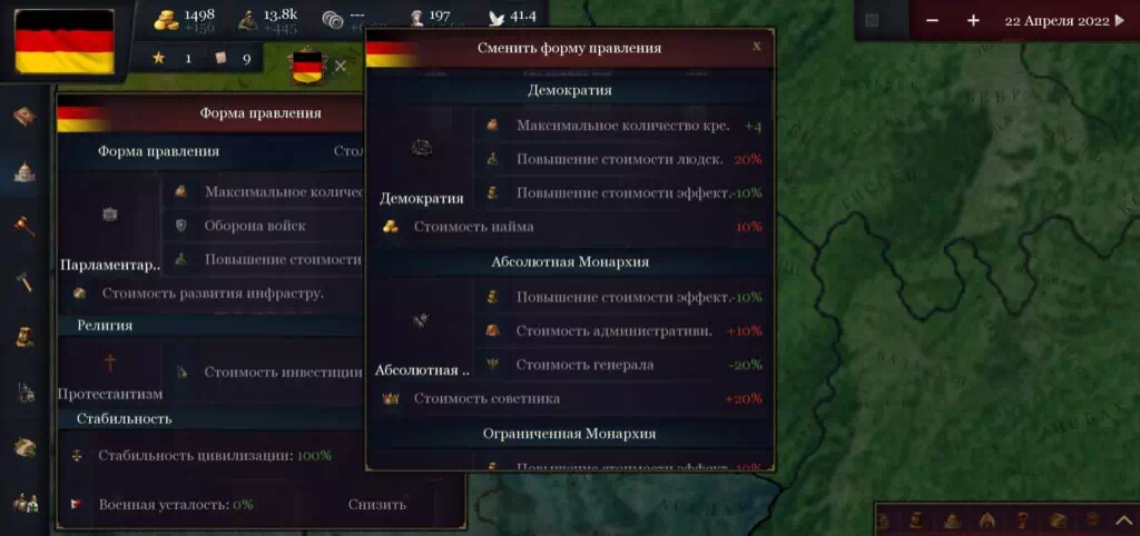 - Добавление новых правительств/идеологий