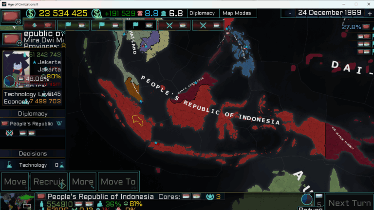 Alice is a mysterious entity (referred to as “Unknown Civilization of Katieverse…?”) that operates only in the Far East. This event can be triggered by the player when a province in the East becomes anarchy, and the player activates the To Break The Seal event and chooses the option “Non Paper Creatures Will Come Out Of Their Room”. Once triggered, the player takes on the role of Alice in the Far East, and manifestations of nightmares begin: decreases in loyalty, administrative disruption, “living paper” illusions, and haunting symbolism in the province. The player, as Alice, may choose whether to expand, regulate, or suppress the nightmare effects.