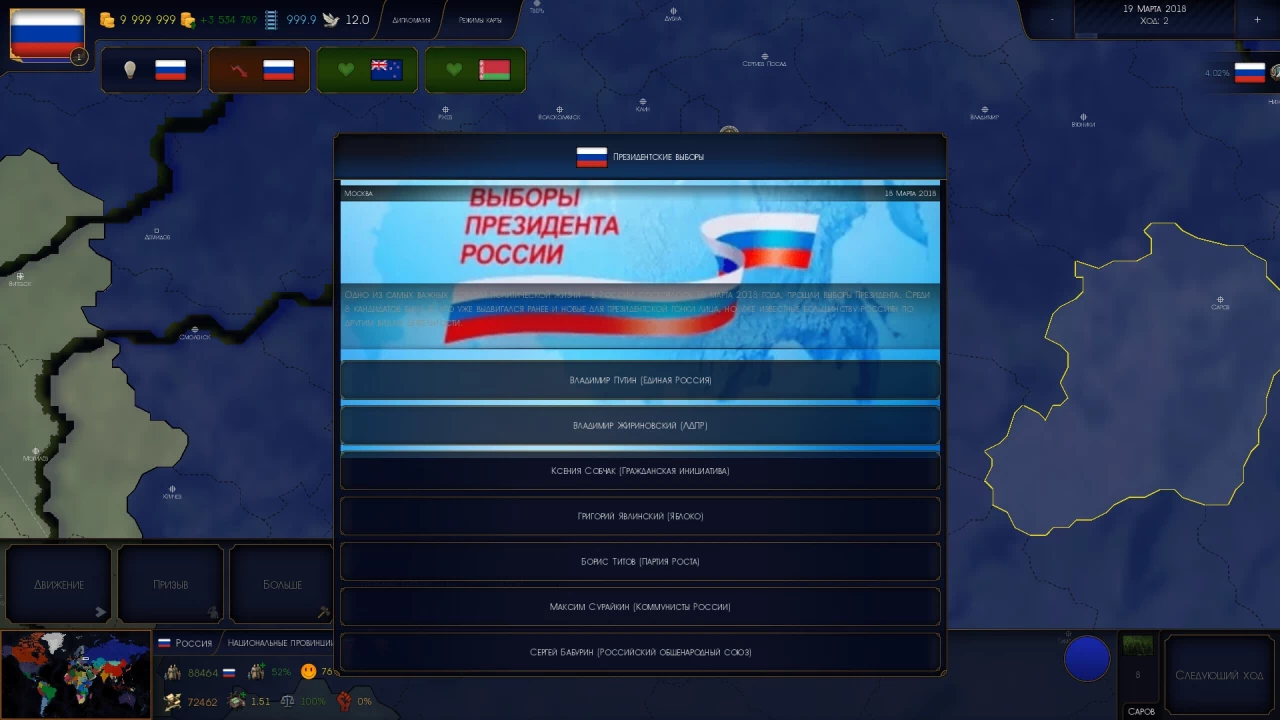 В модификаций найден баг, который не меняет аватарку правителя. Я хотел бы чтобы после ивента выборов президента России 2018 года чтобы аватарка поменялась, а то я вижу мерзкую харю нынешнего правителя!