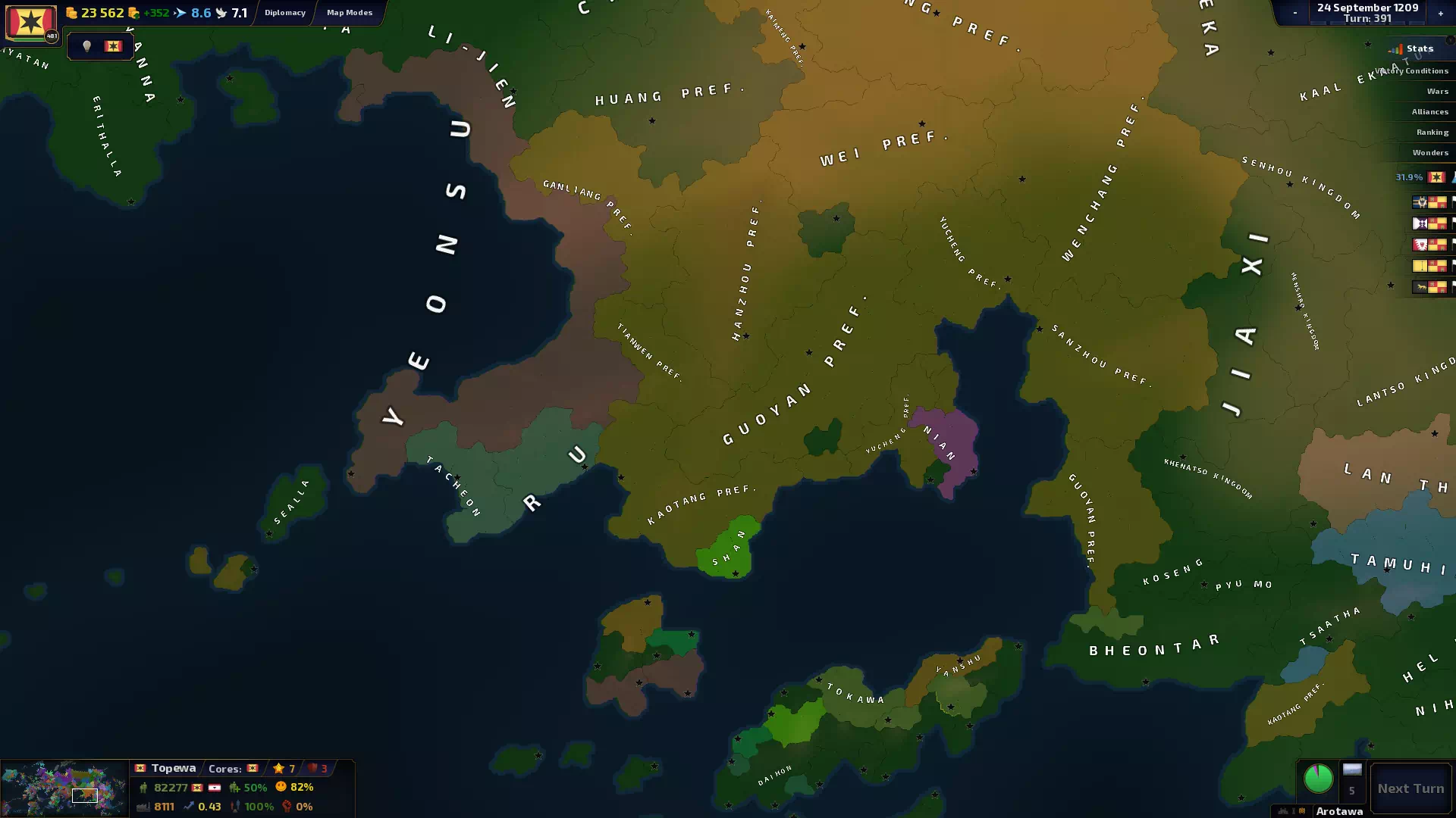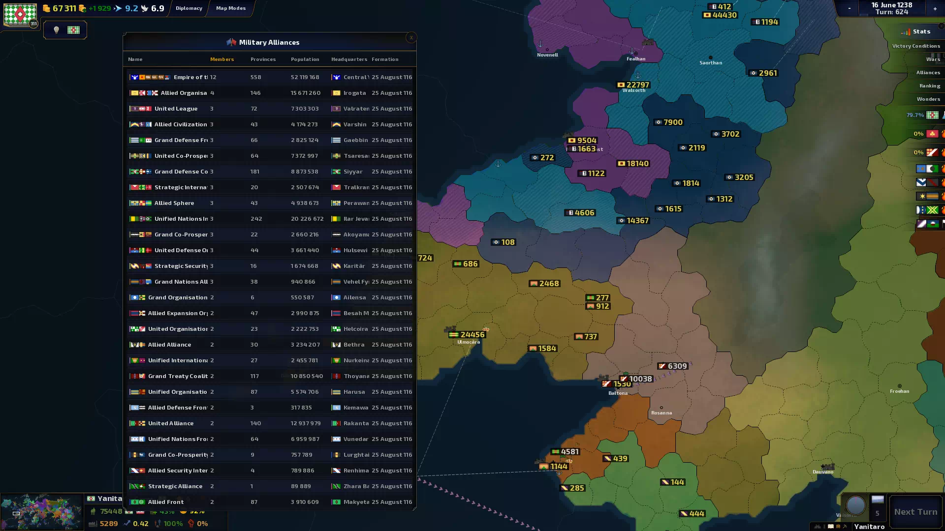 - Одной из первых вещей, которые я изменил для Beta 1.0, было переключение некоторых переменных на 64-битные (что оказалось сложнее, чем ожидалось), что позволило правильно и реалистично отображать население более 2,1 млрд. Возможно, позже я сделаю то же самое для экономики.