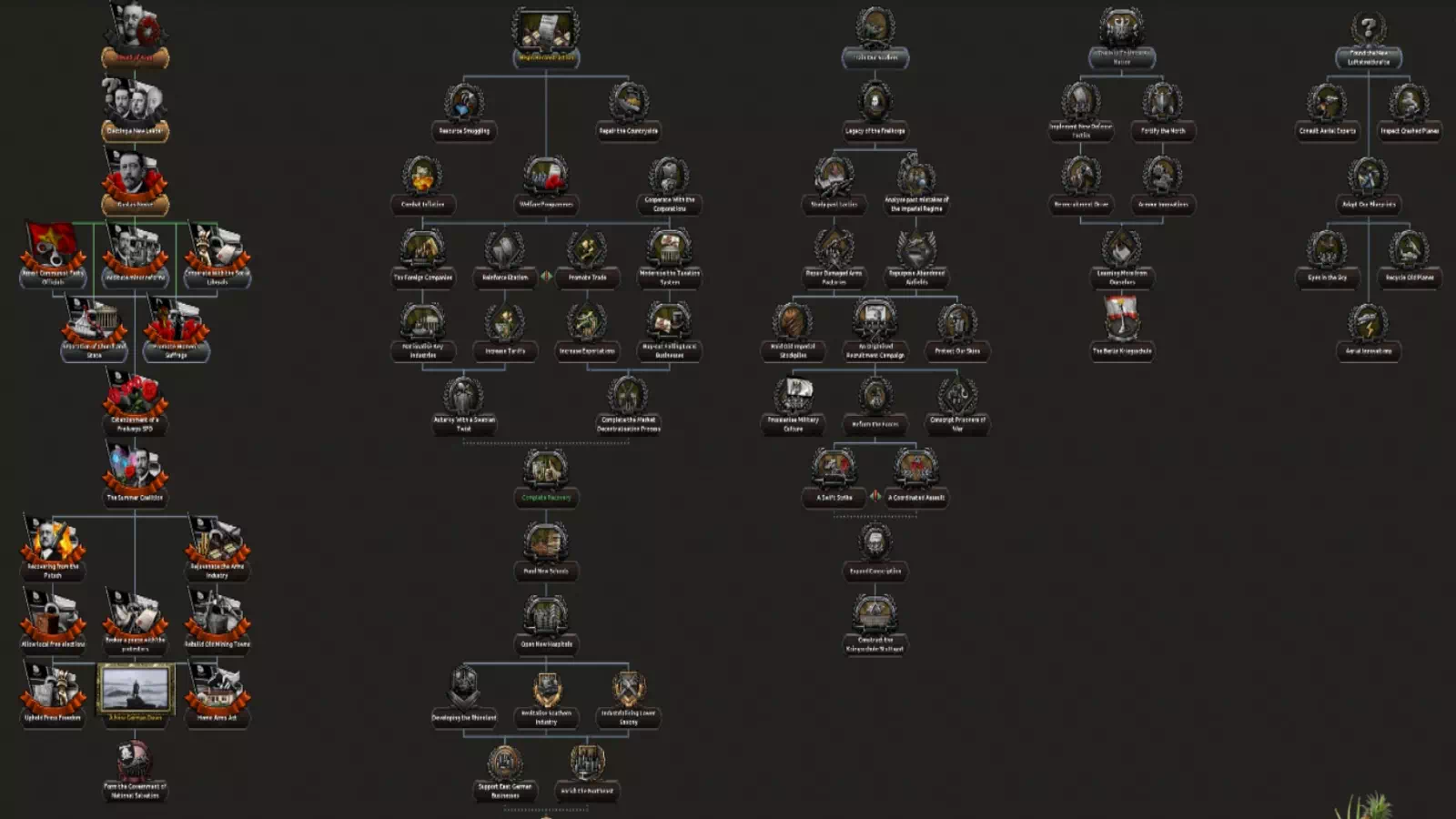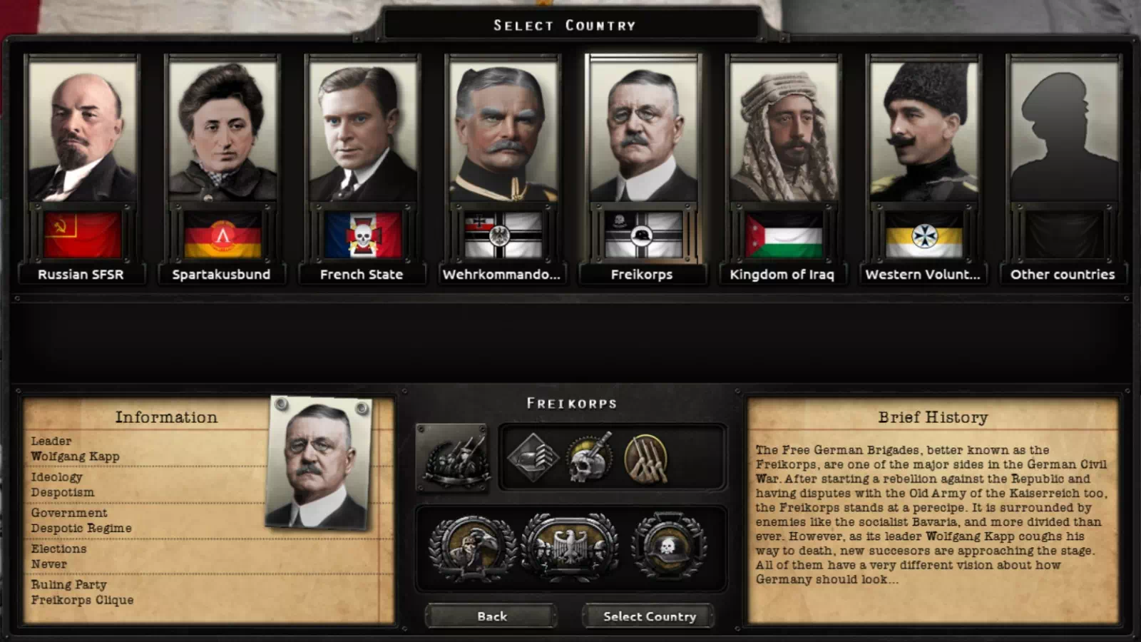 — Чрезвычайно подробный контент Freikorps, особенно для пути Gustav Noske. Военные и экономические деревья также присутствуют.