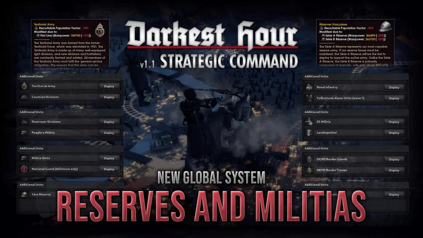 Darkest Hour — это крупный мод для Hearts of Iron IV, который предоставит один из самых исторически достоверных опытов Второй мировой войны, уделяя особое внимание погружению, атмосфере, правдоподобию и точности. С абсурдно хорошо проработанным контентом, полностью оригинальным графическим стилем, полностью переработанной картой, различными новыми оригинальными механиками и многим другим, Darkest Hour вряд ли вас разочарует.