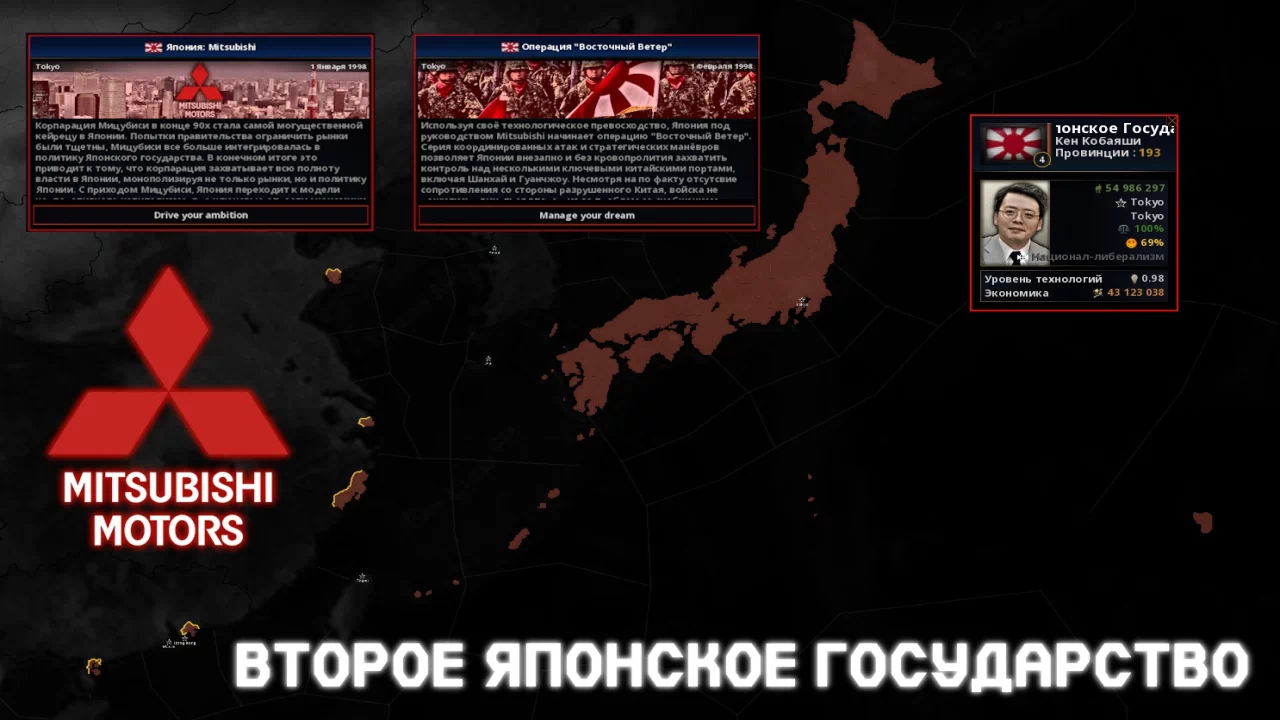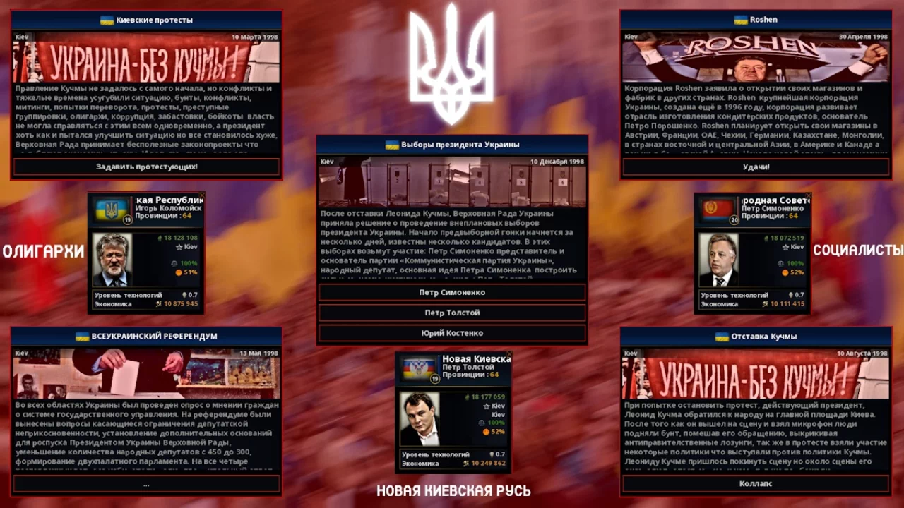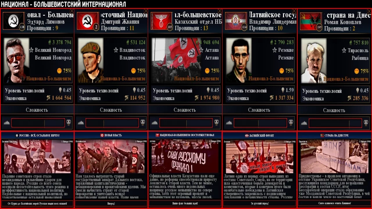 В Disintegrations of Reds: Collaps прописано довольно мало путей, да и картинок к ивентам я пока не добавлял. В качестве теста вы можете поиграть за Камчатку (Горбачёва) или за Евразийское Национальное Государства (Дугин). Можете попробовать поиграть за других варлордов, на них сделаны парочку ивентов.