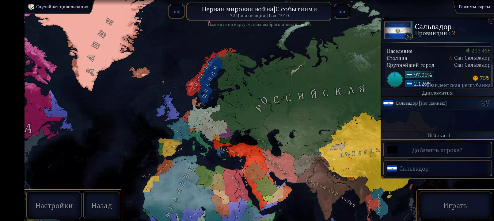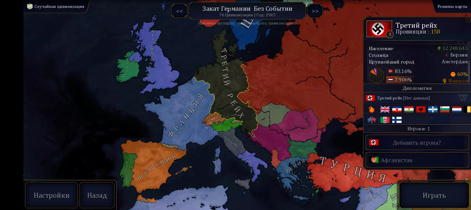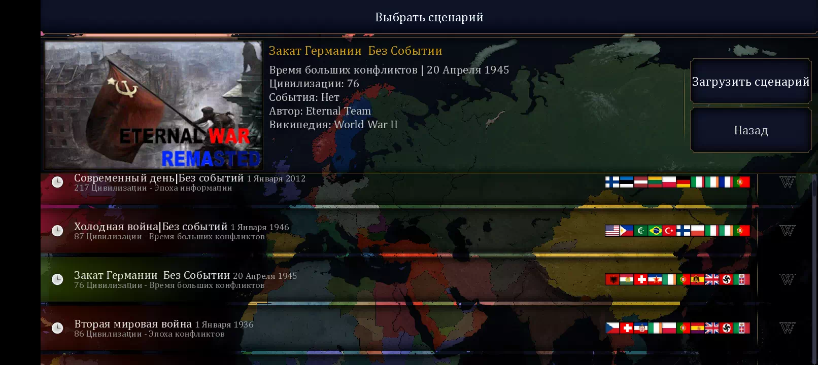 Имба, только жаль, то что тут мало сценариев, но спасибо за сценарий 1945-ого. Предлагаю добавить ещё исторические сценарии 1492, 1525, 1547, 1618, 1660, 1691, 1701, 1756, 1776, 1804, 1812, 1816, 1836, 1848, 1861, 1870, 1893, 1914, 1941, 1942, 1943, 1944, 1991, 2000, 2011, и можно вернуть сценарий 1910.