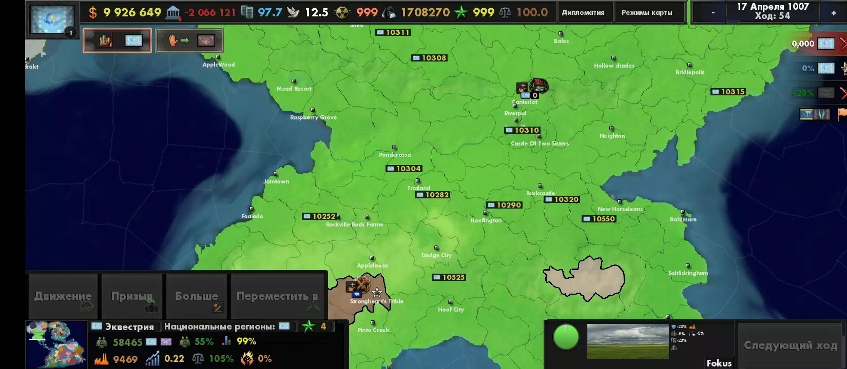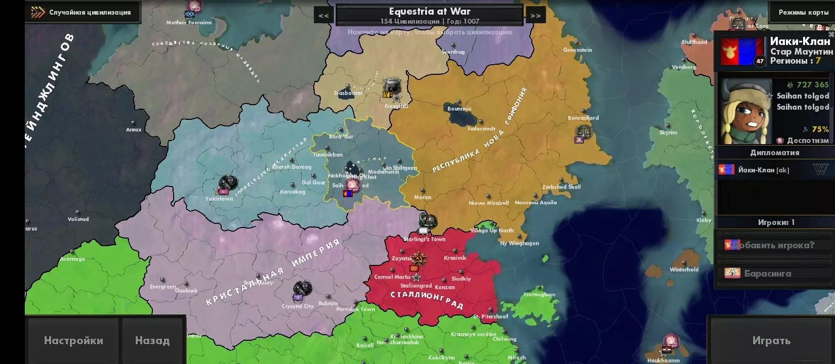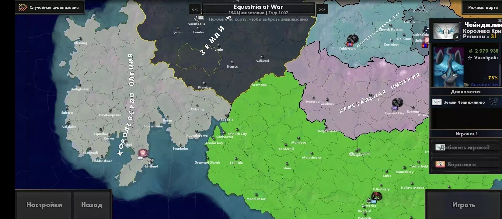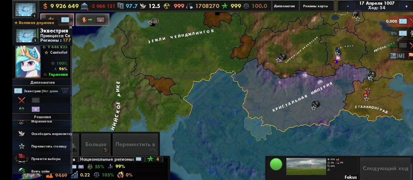 очень весело конечно долбиться 400к войском со всех сторон в 1 провинцую которую защищают 10к и проиграть просрав 30к войск. Может там горы? Да нет равнина.Хммм может много укреплений? Неа нихера нету ,но 400к не могут пробить 10к у которой защита в минусе. Еще более весело когда за Чейнджлингов воюешь против эквестрии. Вы просто стоите смотрите друг на друга ведь не можете ничего сделать. А теперь небольшой гайд как захватить мир. делишь армию на войска по 5к и просто нападаешь вообще везде. есть пробитие? Ну так расстягивай дальше фронт ибо в этом моде нельзя пробиться через войска ,так что захватывай пустые города червечками.