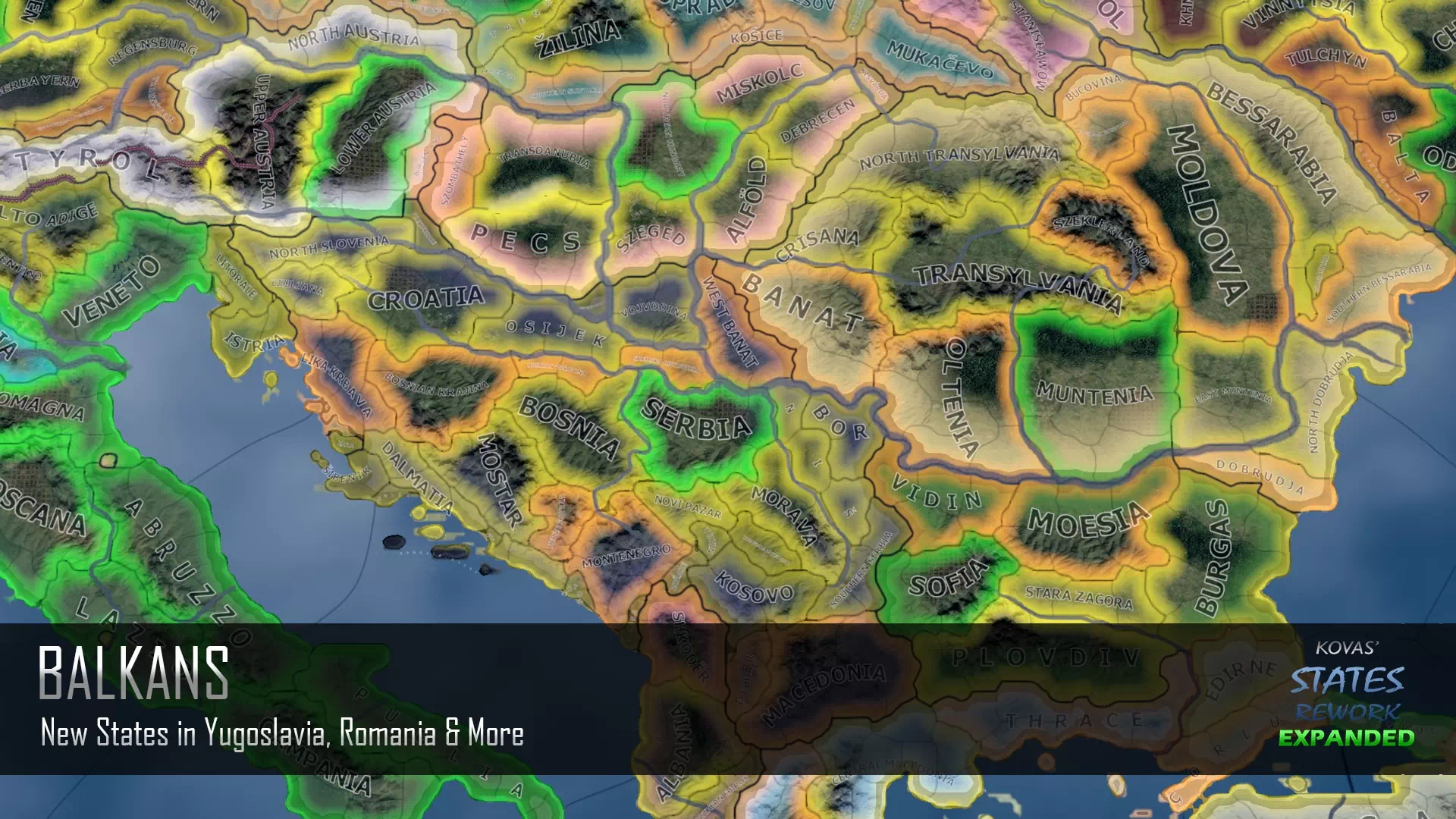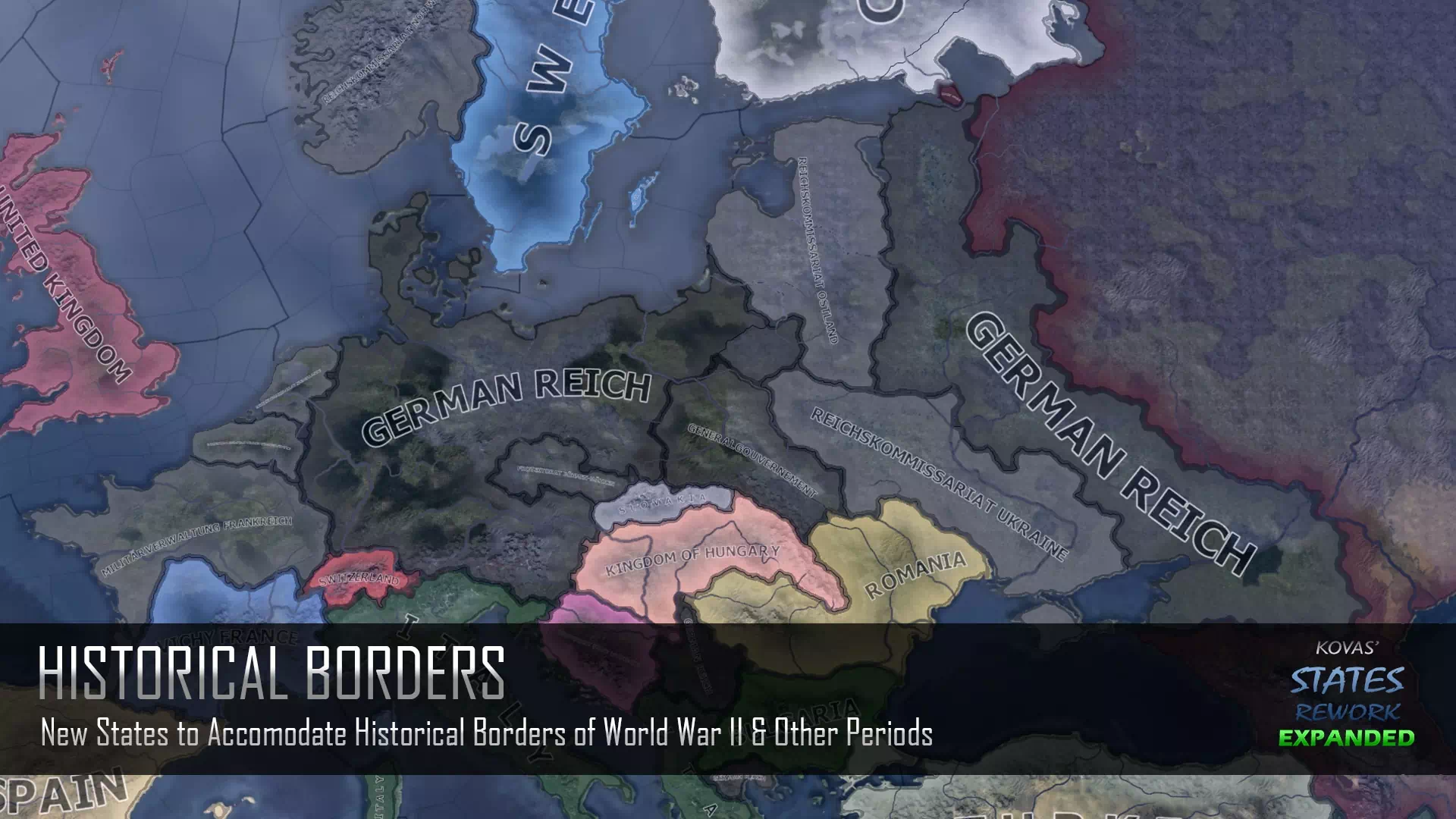 Kovas’ States Rework: Expanded — это мод-продолжение оригинального KSR , который возвращает многие ранее удаленные любимые фанатами функции, такие как переименование штатов и пользовательские предметы. Теперь игроки смогут восстанавливать определенные исторические границы, изгибать территорию вдоль естественных преград, таких как реки, и использовать недооцененные участки суши. Среди новых штатов, которые были реализованы, значительное количество ванильных штатов также были изменены и улучшены.