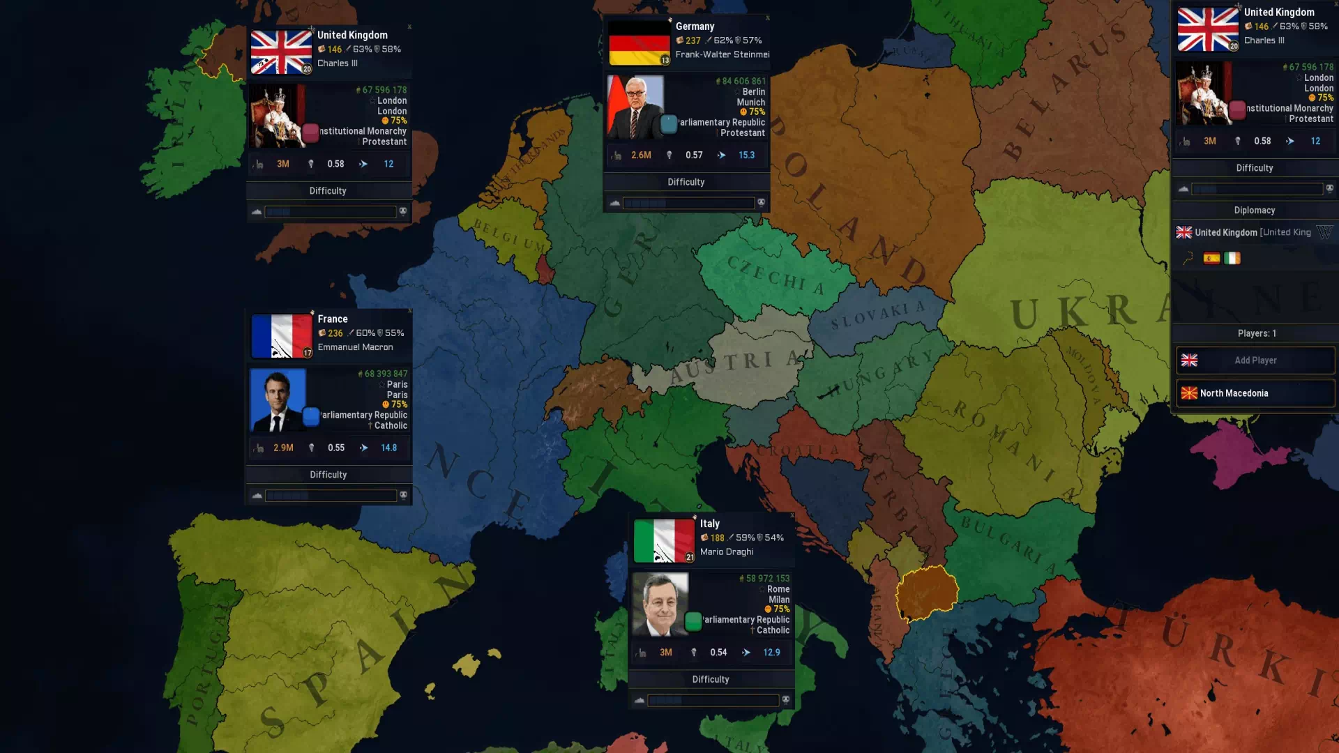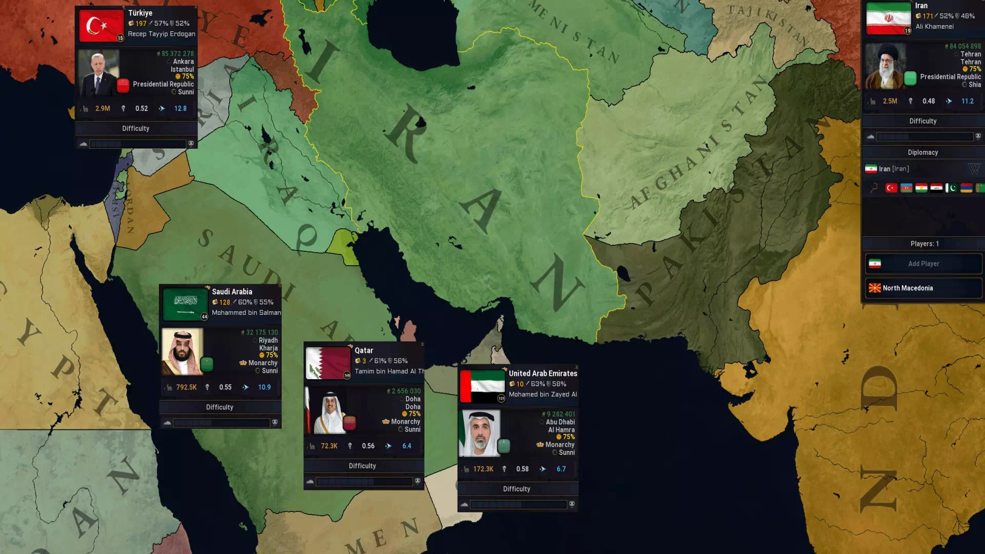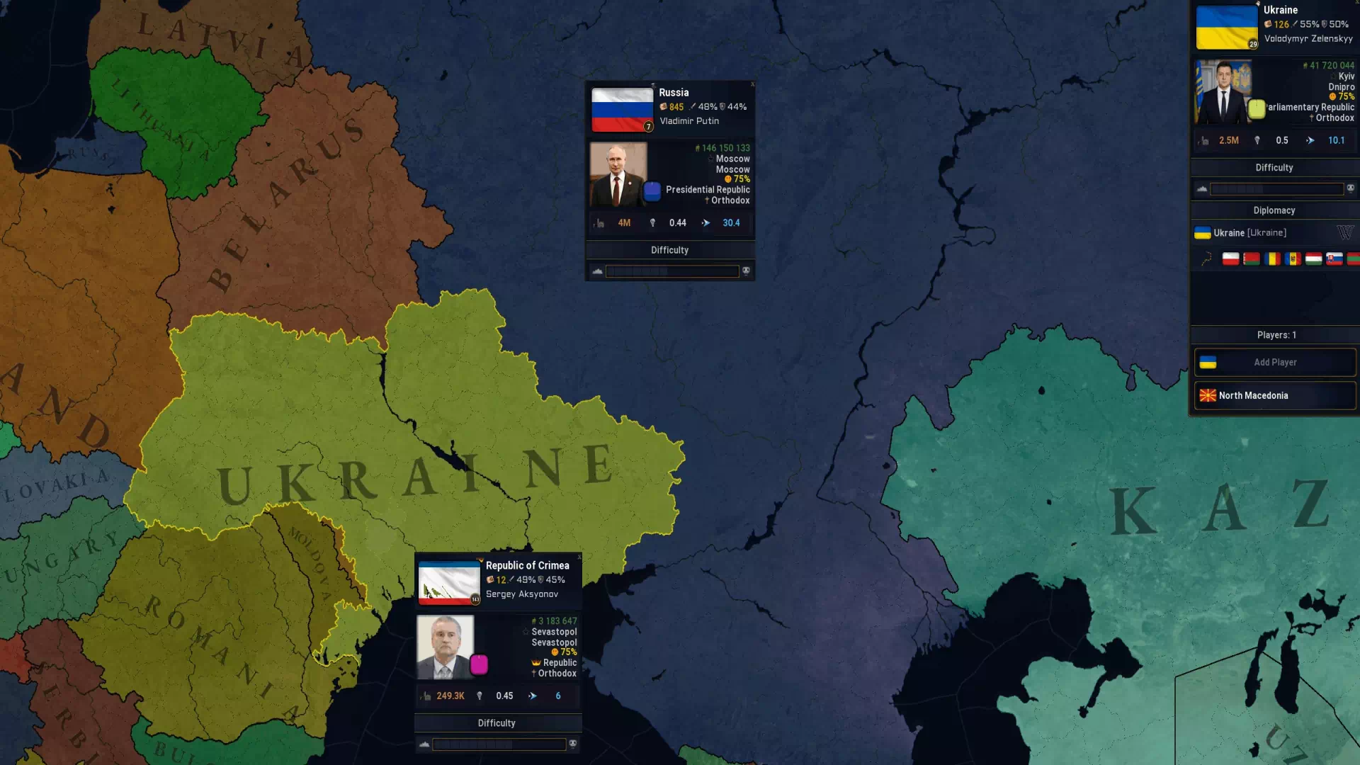 В сценарии представлены все аспекты отношений, альянсы (НАТО, ОДКБ, ССГПЗ, Ось сопротивления), основные территории, религии и улучшенная экономика.