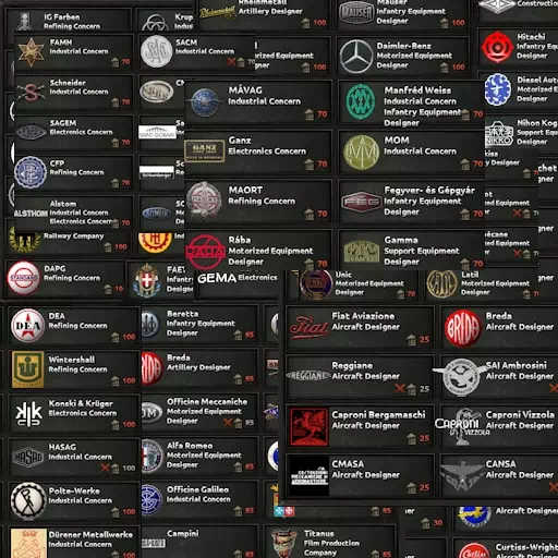 Большинство компаний привязаны к определенному государству и не могут быть использованы, если у них нет определенного количества военных заводов или верфей в этом государстве.