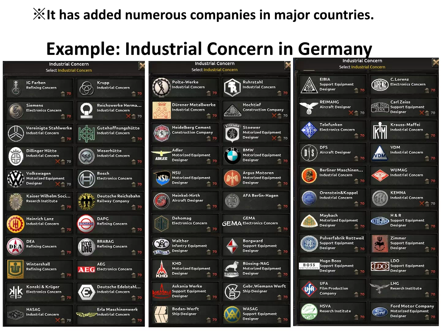 More Military-Industrial Concern добавляет более 400 настоящих военных компаний для основных стран: США, Великобритания, Франция, СССР, Китай, Польша, Содружество Наций и страны Оси.