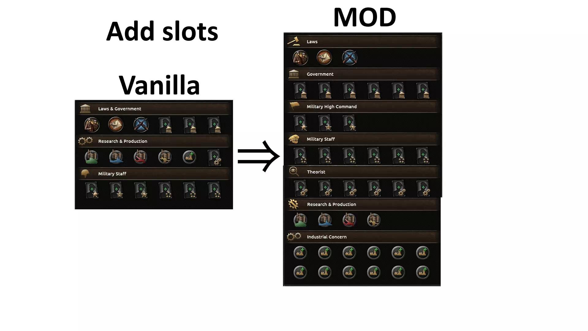 Также количество слотов для «Промышленного концерна», «Политического советника», «Высшего командования» и «Теоретика» увеличено до 6.