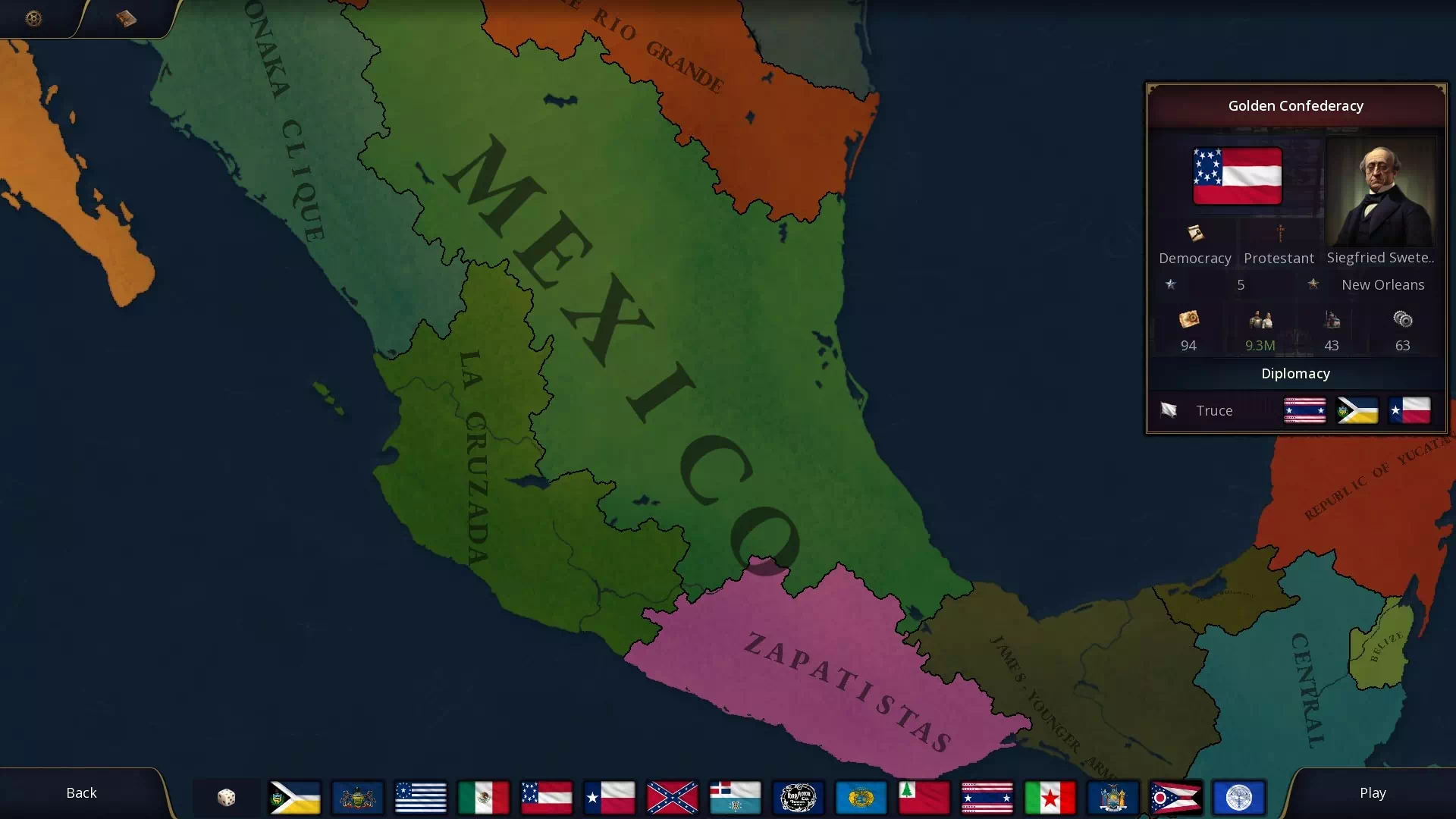 Этот альянс втянул пеннамитов в Великую войну, снова столкнув их с Конфедерацией, которая осталась со своими британскими партнерами. КША, которая, хотя и была унижена северными штатами, сумела доминировать над Мексикой и Карибским бассейном и реализовать Золотой круг, была полностью разгромлена пеннамитами и их неохотными союзниками из Нью-Йорка, отправив ее в смертельную спираль. Оттуда Центральные державы Америки повернули на север, и шаткое влияние Британии в Канаде было подорвано как местными восстаниями, так и вмешательством янки.