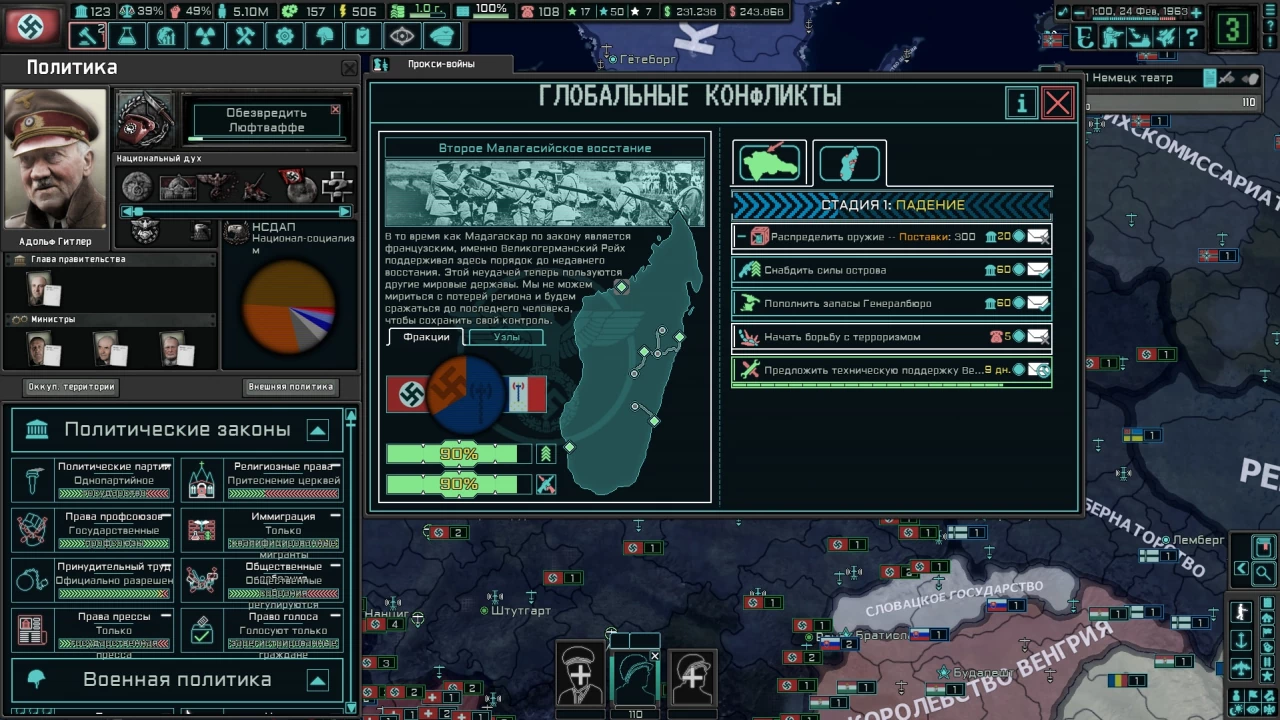 Вы, возможно, уже заметили странные цвета карты, но помимо этого в игре поломана экономика (Ватикан и Монако набирают по несколько сот миллиардов ВВП к 70-м), а также флот. Советую его вообще никак не трогать, ибо велик шанс, что при передвижении корабликов ваша игра будет вылетать.