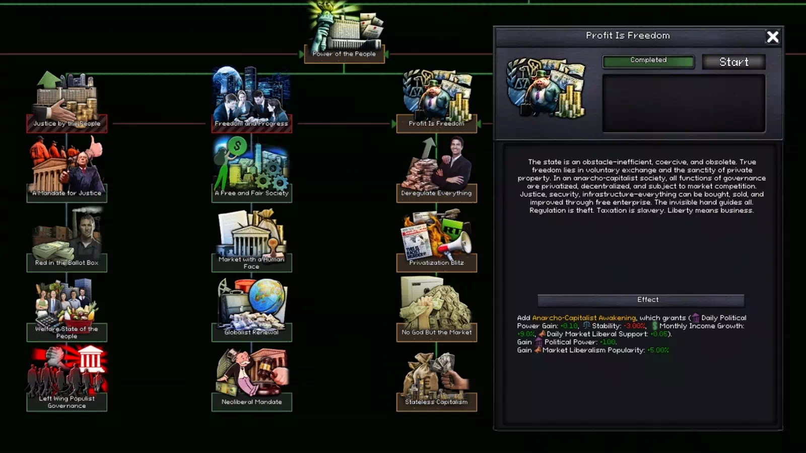 — Теперь в конце каждого дерева фокусов также меняются тип правительства и экономики.