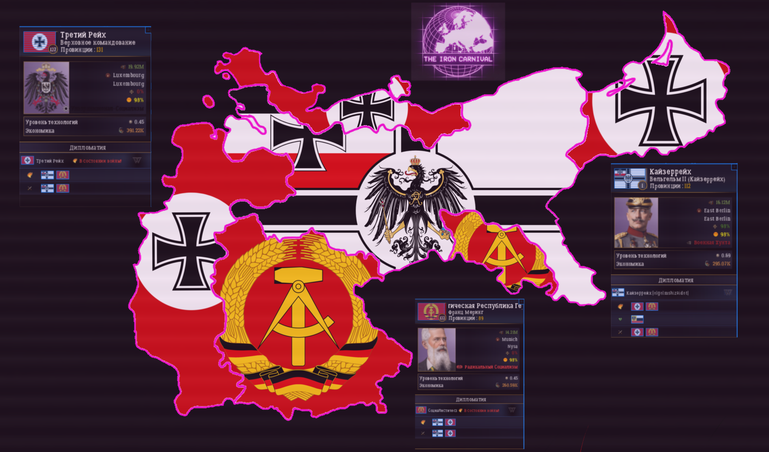 The Iron Carnival — представляет собой модификацию на AoC2, альтернативная история начала XX века, в которой Первая мировая война началась гораздо раньше и закончилась молниеносной победой Германской империи. Немецкое командование успешно применило блицкриг, что привело к распаду России, Франции, Британии и Италии на варлорды. Мод полностью выдуман.