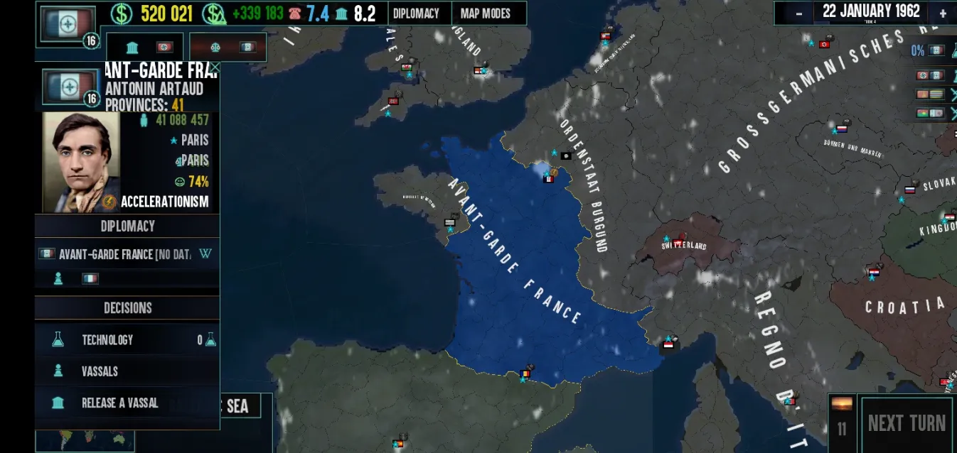 — Red Flood France: Если изменить идеологию Франции на акселерационистскую, у неё будет флаг и название красного потопа, а Арто станет лидером.