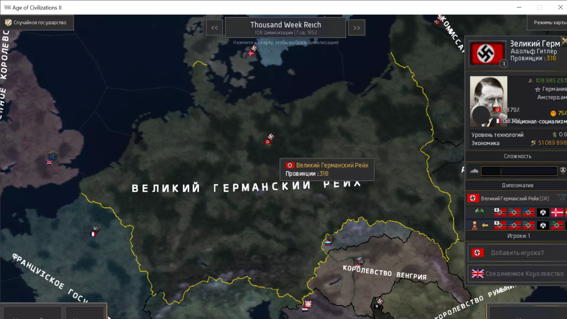Я решил обновить Thousand Week Reich, отличный мод для Age of History 2, который почему-то забросили. За основу была взята андроид версия (потому что она новее) и перенесена на ПК.