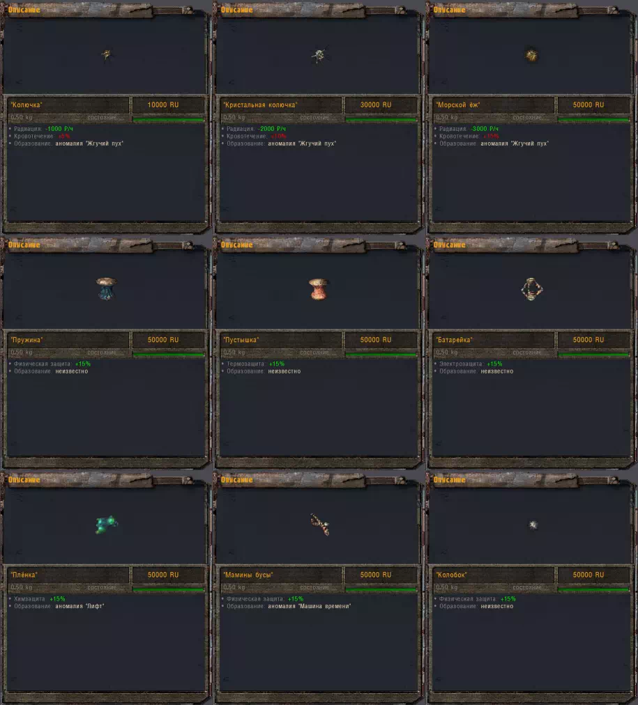 — Переработан лут НПС некоторых группировок (вероятность спавна обычных артефактов уменьшена на 40%, вероятность спавна редких артефактов увеличена на 100%, всем НПС кроме бандитов, военных и зомбированных добавлены очень редкие артефакты);