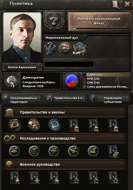 К счастью Беларусь не будет одна в этой войне. Ряд новых решений, фокусов и ивентов окажут ей помощь. - Немного переделана ветка националистов. Добавлен новый фокус и нац. дух «Беларуская военная экономика», а также ряд решений, которые облегчат вам переход на военную экономику.